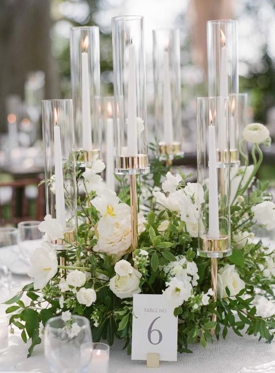 For couples seeking a sleek aesthetic, we offer chic wedding party table centerpieces featuring geometric shapes, monochromatic palettes, and clean lines.