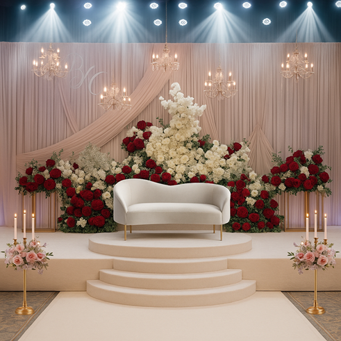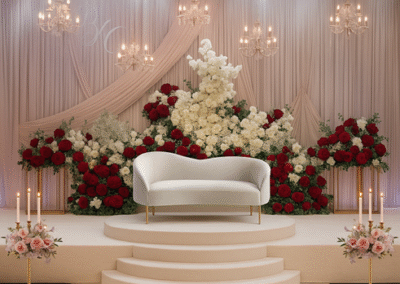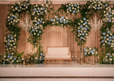 Our luxury wedding stage decorations bring together breathtaking floral walls, cascading blooms, and statement chandeliers that immediately set the tone for elegance. -